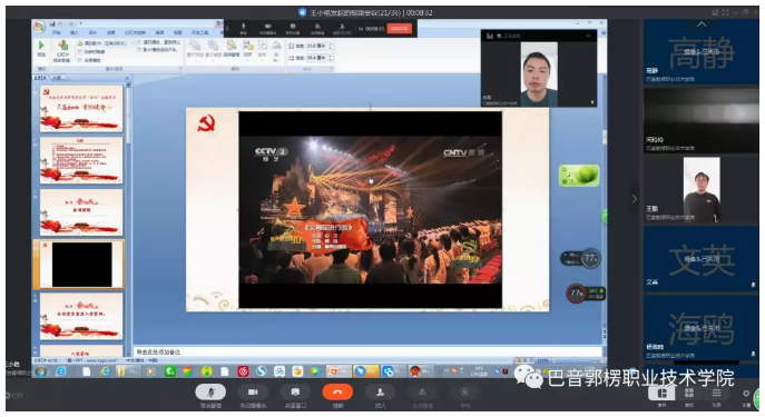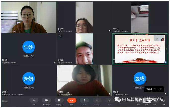 本次活动在庄严的国歌中拉开序幕,共四个环节。全体党员合唱国歌、重温入党誓词。组织委员王小艳向全体党员通报2020年第一季度党费交纳情况。宣传委员高洁带领全体教师诵读党章(第七章 党的纪律)、组织委员王小艳讲党课《不忘初心,牢记使命,团结抗疫,战疫必胜》、教师代表杨海鸥作“居家教学,党员示范”表态发言。组织委员王小艳通报本月“每课三分钟”点、评、审、推情况,党员代表曾妍妍展示“每课三分钟”课件。