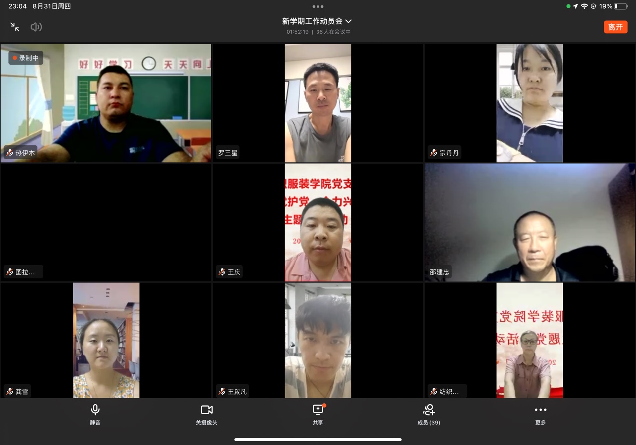 2023年8月31日下午21:00,新的学期已经开始,为进一步统一思想、营造氛围,高质量地开展教育教学工作,纺织服装学院全体教职工在钉钉线上开展了新学期教育教学工作动员会,会议由教学院长成艳丽主持,纺织服装学院共37名教师参会。