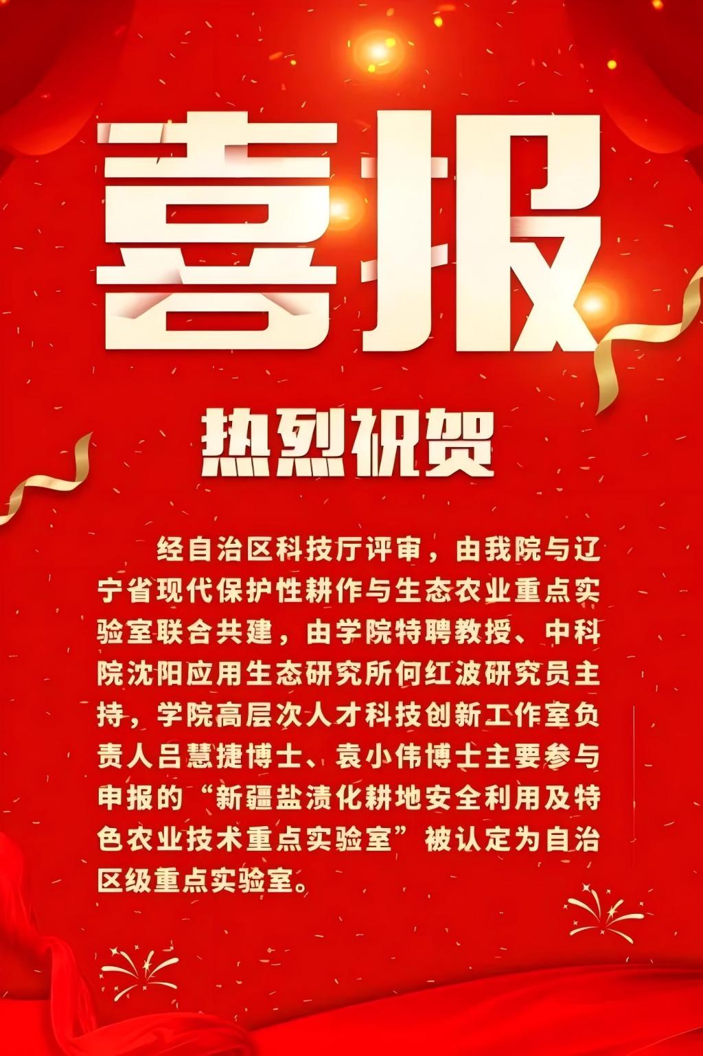 近日,自治区科技厅组织完成了2024年度自治区重点实验室申报评审工作,并对拟认定自治区重点实验室进行了公示。由巴音郭楞职业技术(以下简称巴音学院)与辽宁省现代保护性耕作与生态农业重点实验室联合共建,由学院特聘教授、中科院沈阳应用生态研究所何红波研究员主持,学院高层次人才科技创新工作室负责人吕慧捷博士、袁小伟博士主要参与申报的“新疆盐渍化耕地安全利用及特色农业技术重点实验室”获得认定,被立项为自治区重点实验室。