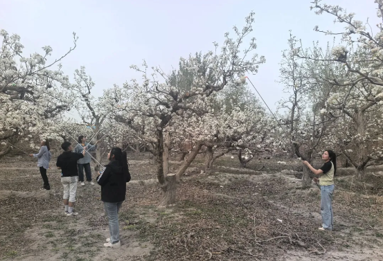 授粉前,企业技术人员向学生们详细讲解了库尔勒香梨的生长周期及授粉的意义,并演示了使用授粉工具的正确方法。随后,学生们分成小组,按照分配区域进行授粉。学生们将花粉均匀涂抹在每一朵花上,确保每一朵花都能得到充分的授粉。期间,企业工作人员不断巡视,及时给予技术指导。