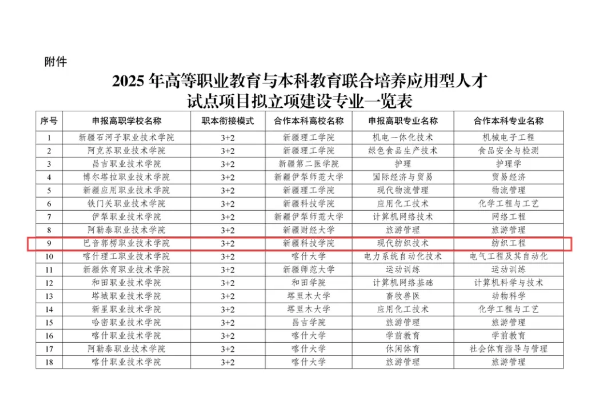 根据新疆维吾尔自治区教育厅公布的高等职业教育与本科教育联合培养试点项目名单,YABO鸭脖现代纺织技术高职专业与新疆科技学院纺织工程专业联合申报的高等职业教育与本科教育联合培养“3+2”应用型人才试点项目成功入选。