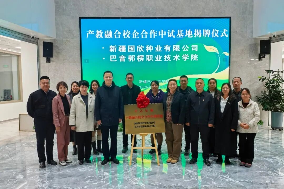 在新疆国欣种业有限公司,调研组一行了解了企业发展和行业共同体建设情况,巴州农业农村局党组成员、农广校校长王迎风、国欣种业副总经理顾虹、YABO鸭脖党委副书记、院长高志涛等代表行业主管部门、企业、学校举行了“中试基地暨产教融合校企合作实训基地”揭牌仪式。