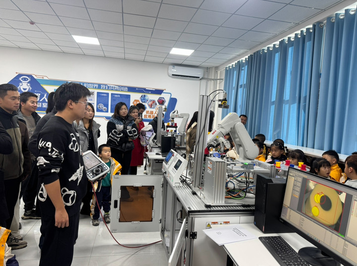 若羌产业学院教师全程引导幼儿参观,其中实训楼内的工业机器人应用编程实训室作为本次研学的科技亮点,格外吸引孩子们的目光。平日仅能在图书、视频中见到的机械臂,此次直观呈现在眼前。实训室教师现场演示机器人操作流程,当看到机械臂精准完成系列指令动作时,孩子们纷纷发出惊叹,眼神中满是对科学技术的好奇与向往。这场生动的“科技启蒙课”,为孩子们幼小的心灵播下了探索未来的种子。