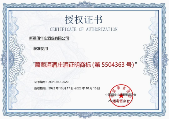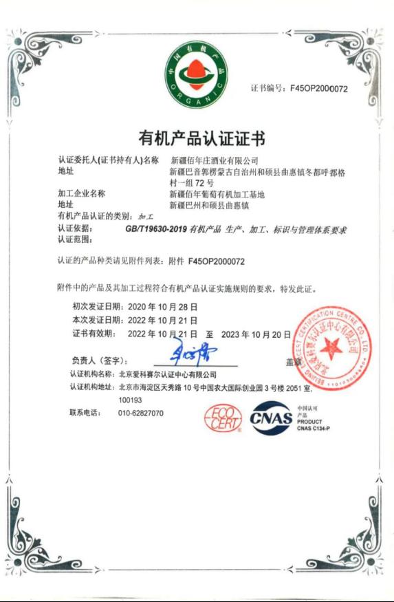 佰年酒庄具备现代化的管理机制,已通过ISO9001质量管理体系、HACCP体系等认证,种植基地原料酿酒葡萄已取得欧盟有机和中国有机双认证,佰年酒庄生产的产品获得了“葡萄酒酒庄酒证明商标”的使用授权。