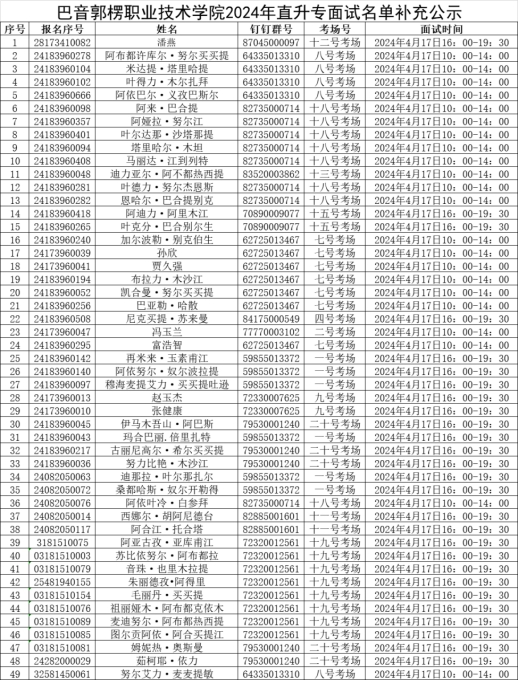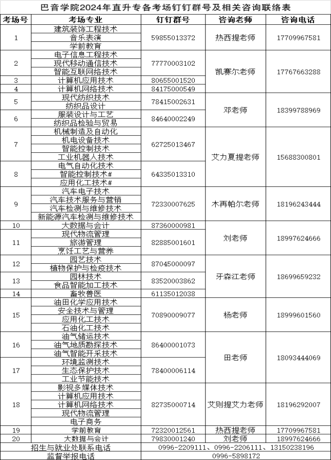根据我院YABO鸭脖2024年优秀中职毕业生直升高职(专科)(以下简称“直升专”)报名及线上面试工作安排,现对我院2024年直升专补充面试名单予以公示,请名单中的学生根据我院考场安排在4月16日16:00前使用本人手机登录钉钉,在下表中查找自己所在考场群号,钉钉搜索该群号,查找公开群组,备注 “序号+姓名+电话”,申请加入考场钉钉群,并按要求填写(核准)相关信息,并按照班主任要求打印准考证。