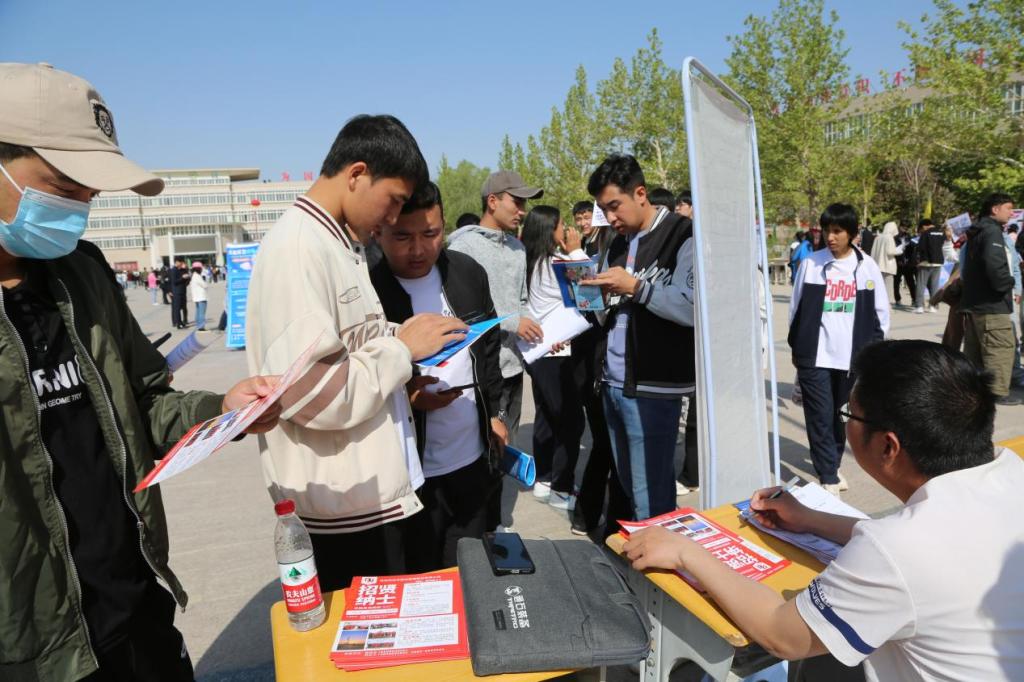 启动仪式结束后,很多展位前都排起了长队,招聘单位通过发放宣传单、面对面交流等方式向毕业生们介绍企业概况、职业发展方向、人员需求以及薪资待遇等,毕业生们都手持自己精心制作的简历,认真聆听招聘人员宣讲,主动了解用人单位基本情况,积极寻找心仪岗位。沈平江、阿依先木·吉力力一行在招聘会现场与招聘企业、应聘学生亲切交谈,详细了解各用人单位的招聘情况及毕业生求职情况,鼓励毕业生抓住机遇,尽快找到适合自己的工作岗位。