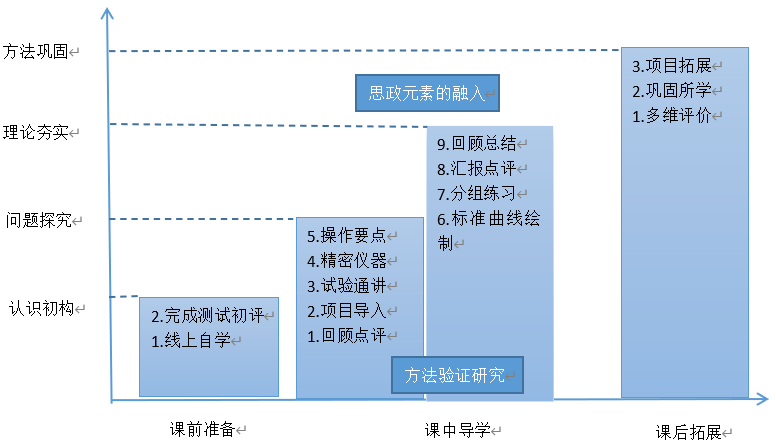 发布本次课预习任务单,学生进行线上自学和测评,教师进行线上测试并统计测试结果、据此调整教学策略并备课。 利用翻转课堂的教学模式,学生在课前已经了解有害物质的种类,对身体的危害,初步了解测定方法,课堂进行试验通讲,提高教学效率。 |