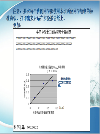 为了达到学生实际掌握绘制标准曲线的任务,提高数据处理能力。指导学生自己动手在电脑中进行标准曲线的绘制。 |