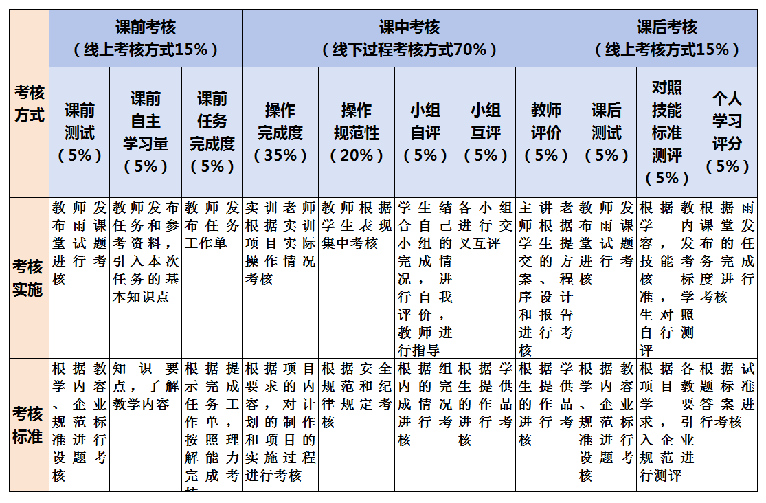 课程采取过程化考核方式及形成性评价机制,通过关注学生的学习过程,促进混合式教学效果的提升。通过在线学习、课前作业、课堂表现、课后作业多个时空维度综合考察学生的学习能力和学习效果, 具体如下:总评成绩=平时成绩60%+期末成绩40% 平时成绩=课前(课前测试+课前自主学习量+课前任务完成度)15%+课中(操作完成度+操作规范性+小组自评+小组互评)70%+课后(测试+对照技能标准测评+个人学习评分)15%