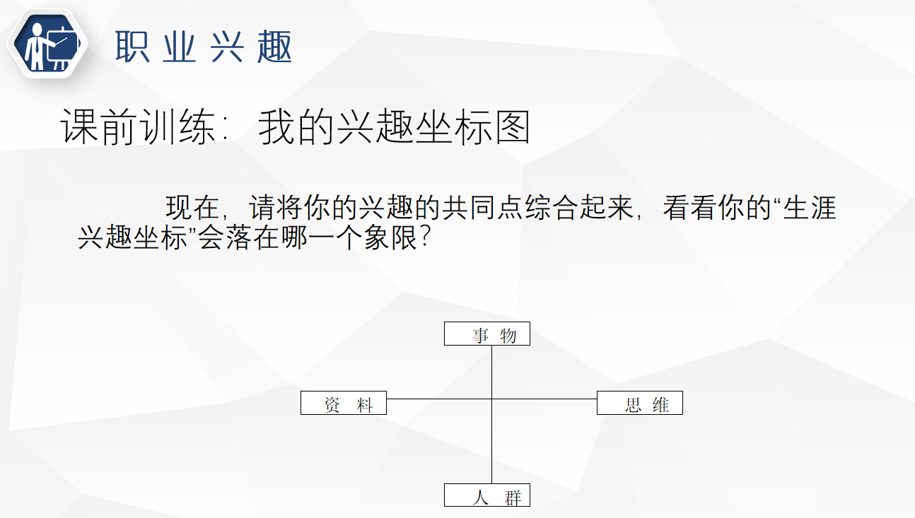 知识目标:了解职业兴趣的概念和内涵;能够认识个人兴趣和所从事的职业的内在关联。