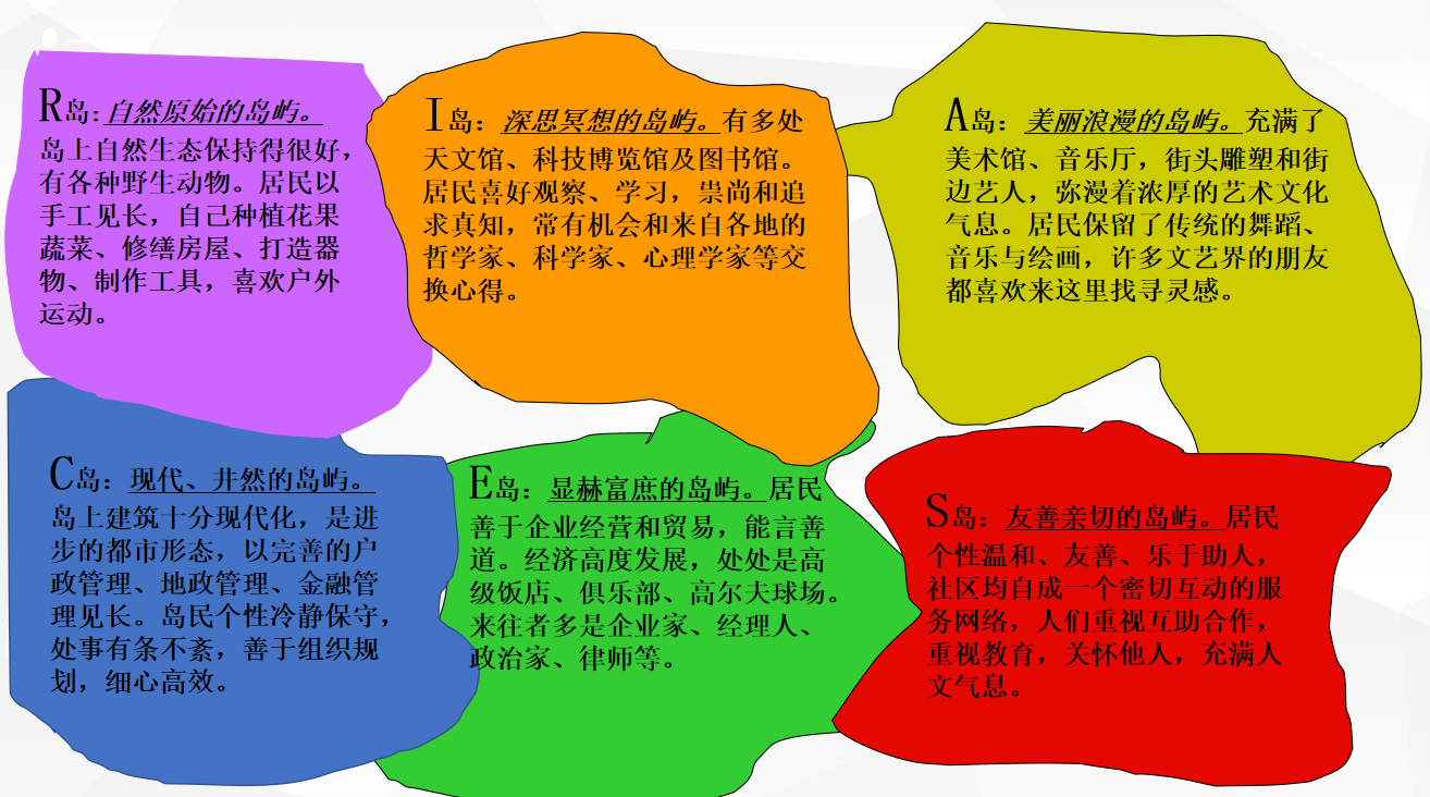 三是课堂讲授与训练结合,夯实核心知识和技能。解析当次课的重点和难点,引出职业兴趣的概念,引导学生明白职业兴趣对职业选择的意义,然后依据课程内容适时发布课堂活动“兴趣岛的选择”,按自己第一选择的岛屿分组并推选产生自己的岛主,制作本组小岛海报:岛名,标志,关键词、岛歌。每组选派代表上台展示。