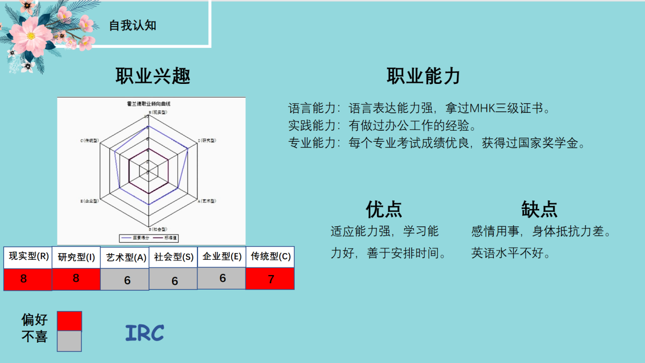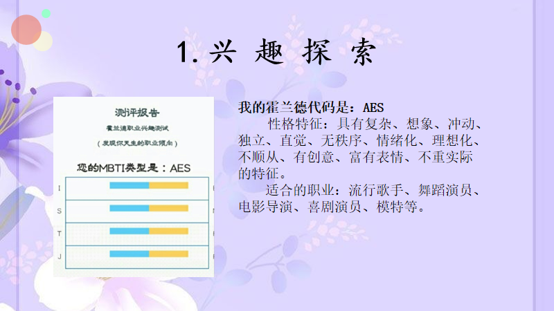 能力(技能)目标:分析本人发展条件,选择出一些符合自己的兴趣特征的职业或职业领域,借助专业测量工具,在老师的指导下,挖掘自己未知的职业兴趣,找到培养方法。
