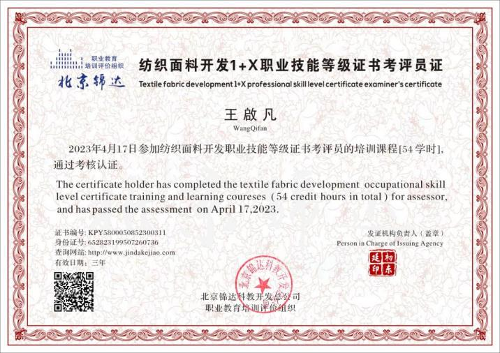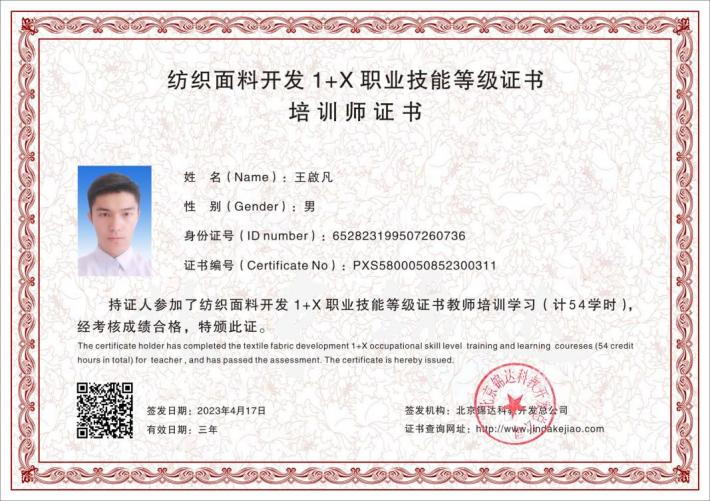 图4 纺织面料开发“1+X”考评员证、培训师证
