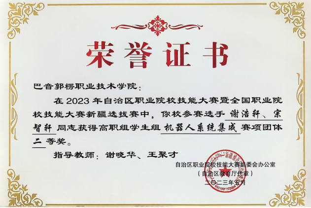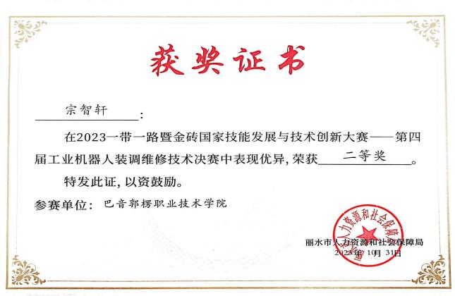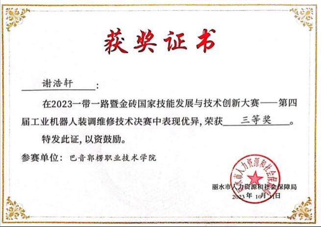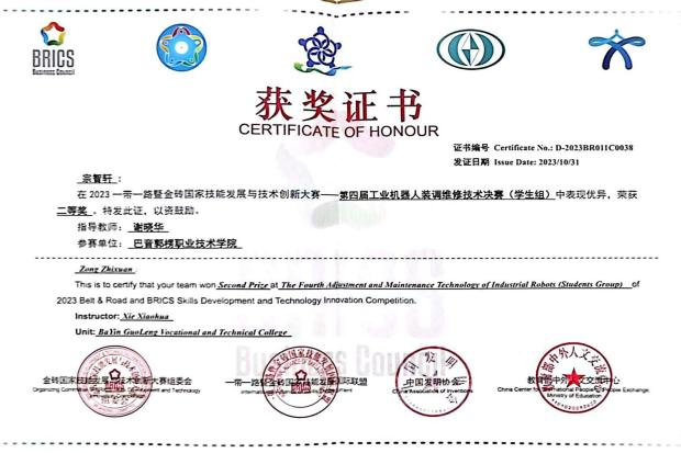 图6 2023年一带一路暨金砖国家技能大赛学生获奖证书
